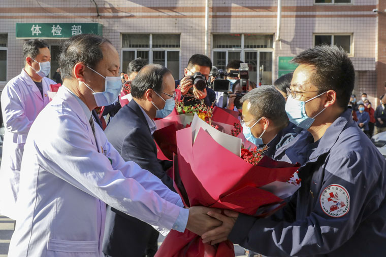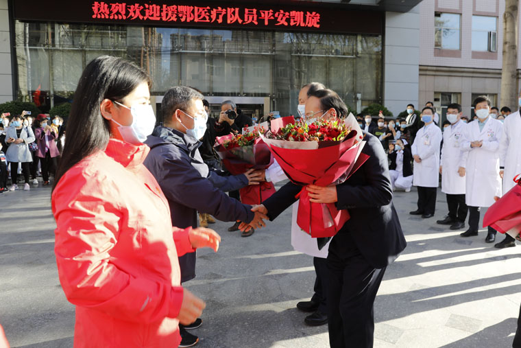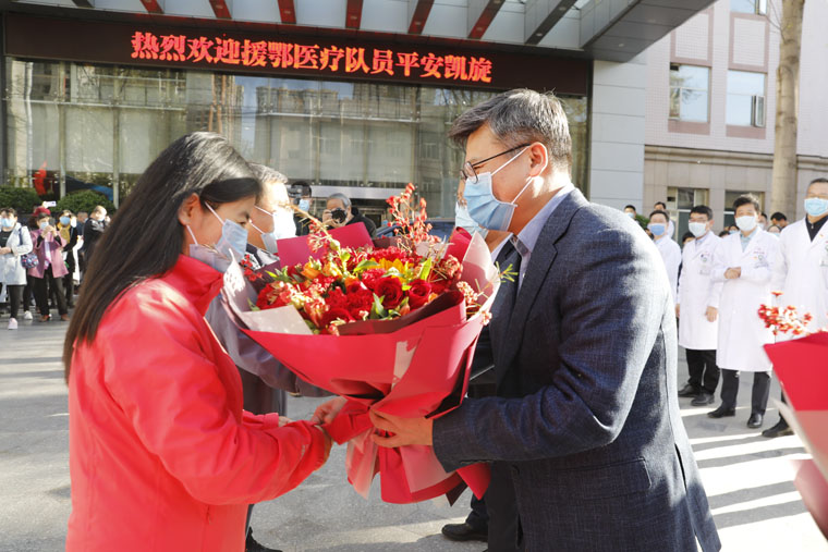 本是乍暖还寒的季节,我院前庭广场却是一派暖意。医院为队员们举行了简捷而热烈的欢迎仪式。河北医科大学党委常委、党委副书记倪铁军,党委常委、副校长闫宝勇等领导到现场为勇士接风。学校党委常委、副校长、我院党委书记单保恩,院长徐金升和全体院领导、队员家属以及相关科室人员共同迎接亲人回家。领导、家属和同事为勇士们献上了代表思念和祝福的鲜花。