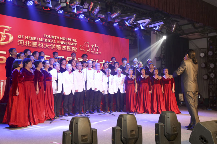 我院用精心准备的配乐朗诵《大医精诚》,舞台剧《战癌壮歌》、《心系赞皇》,舞蹈《迈进新时代》、《红烛》、《共圆中国梦》,民乐演奏《良宵》,歌曲《为了谁》,快板表演《医路逐梦》,合唱《河北医大四院院歌》,大型歌舞《白衣薪火》以及老前辈和青年人拍摄的祝福视频等形象生动地展现出一代代四院人在不同历史时期,用医者仁心和大爱无疆诠释医学誓言的感人事迹,表达了对建院65周年的热情庆祝和殷切祝福。现年85岁的林元珠教授在接受采访时说:“能够参加建院65周年纪念表彰大会让我感到非常荣幸,支撑我在医学领域不断探索、努力工作的动力就是因为我有为共产主义事业奋斗终生的伟大信仰。希望年轻的四院人能够胜过我们,长江后浪推前浪,一代更比一代强。”
