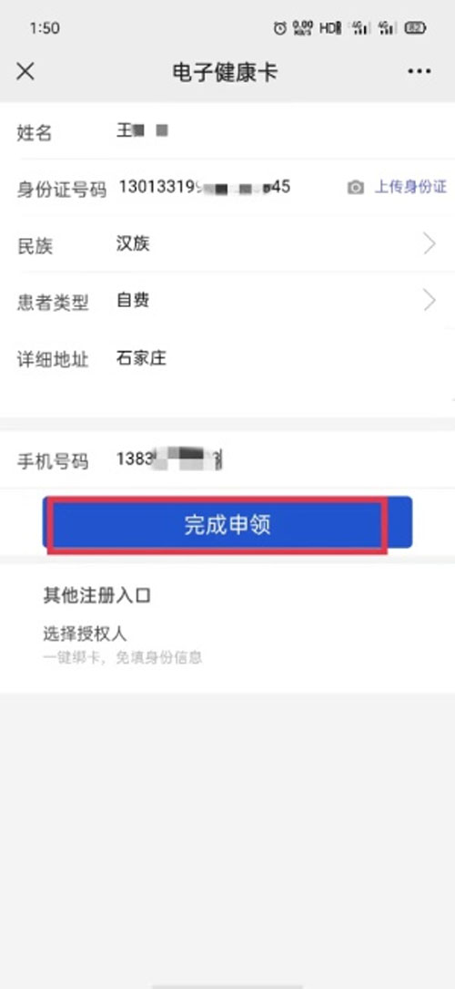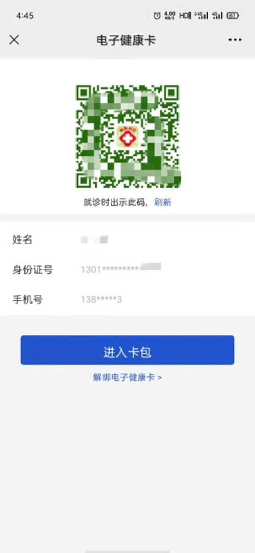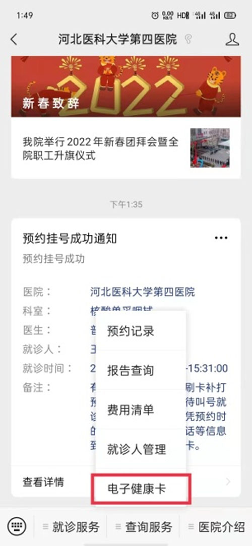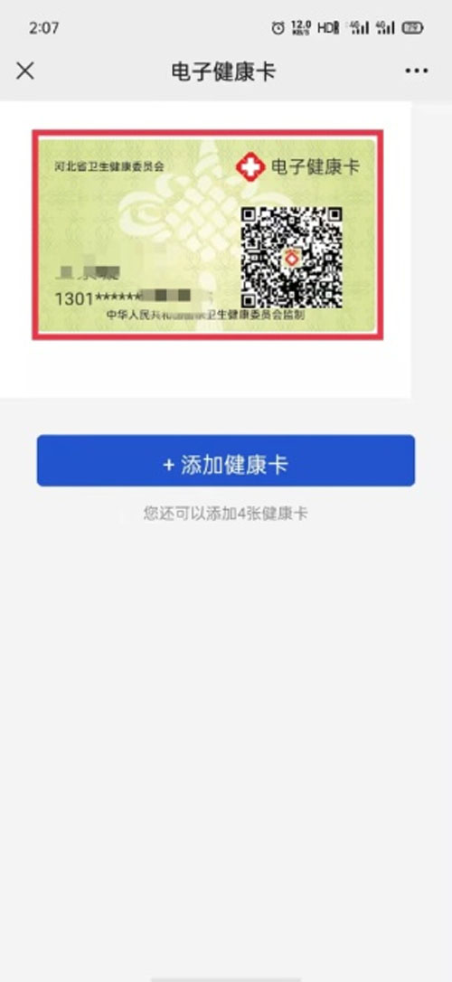 查询服务→电子健康卡→添加电子健康卡(可以添加多人)→填写个人信息→添加成功后会在电子健康卡列表中显示。