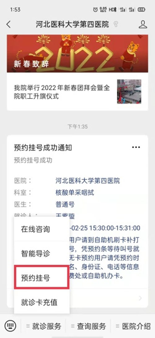 就诊服务→预约挂号→选择科室→选择时间和医生→点击预约→选择时间段→选择就诊人→确定预约→跳转到缴费列表中→确认支付→支付完成→查询预约记录→我的挂号中可查看到挂号信息。