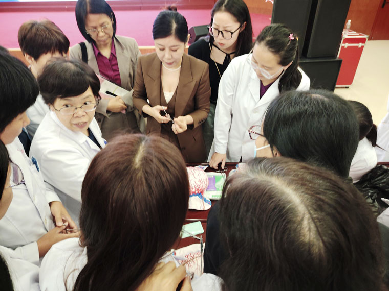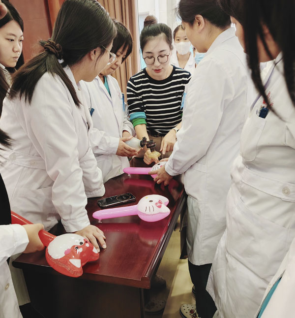 实操环节,杨志芬副主任从基础解剖结构、盆腔血管走行讲起,并结合提前录制的操作视频和子宫模型现场操作,直观、清晰地讲解了规范的子宫切口缝合技巧以及各类手术止血方法。刘艳华医师就新生儿复苏要点进行手把手指导,并指导团队协作,提高新生儿窒息复苏救治水平。培训期间,特别采用卡通气球替代复苏囊演练新生儿复苏,既克服了购买模型的费用问题,又提高了模型的仿真度。现场氛围热烈,大幅提升了学员的学习积极主动性。